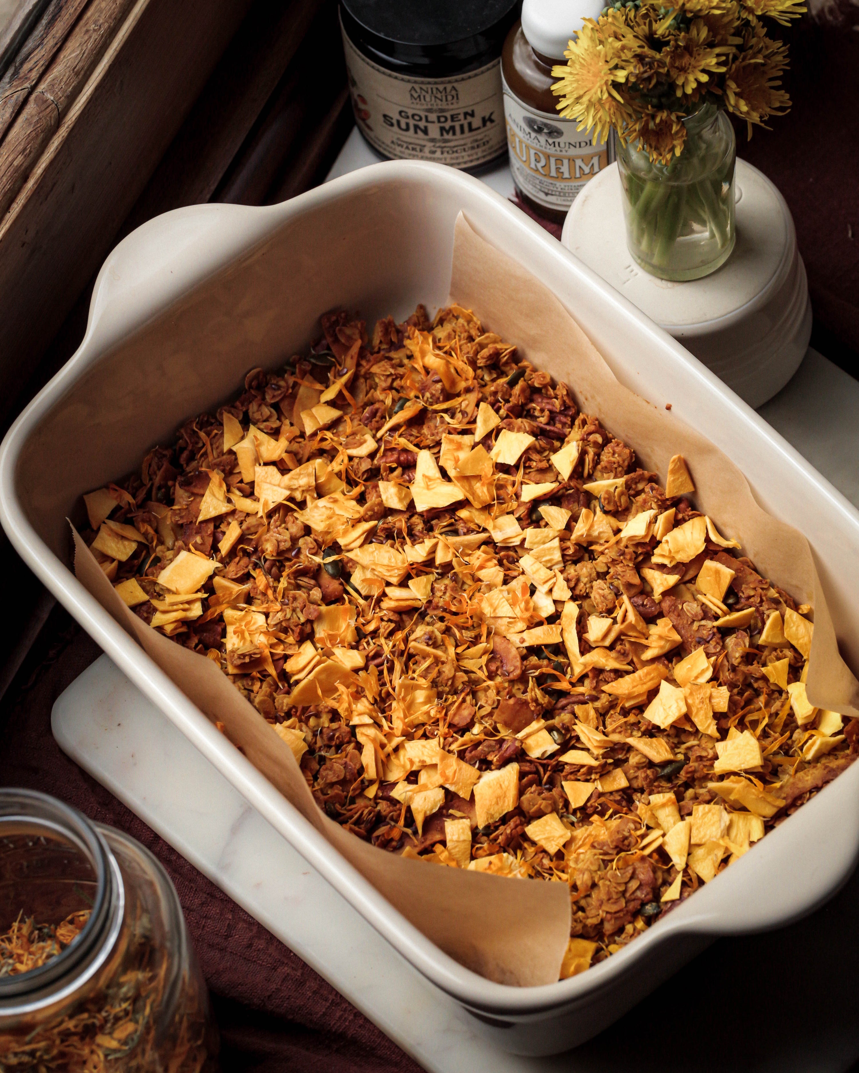 Infused with the adaptogenic goodness of Golden Sun Milk and kissed by the tropical sweetness of mango and coconut, this soul-nourishing granola is a golden ode to slow mornings and sunlight. Rolled oats, toasted pecans, flax, and pepitas are gently baked with coconut oil, maple, and a touch of coconut butter—then crowned with chewy mango pieces and optionally adorned with calendula petals for an extra layer of botanical beauty.