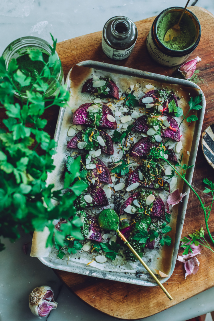 - The earthy sweetness of the purple potatoes creates a beautiful canvas for the mineral-rich notes of the Moringa pesto: the pesto’s tangy bite cuts through the sweetness perfectly.