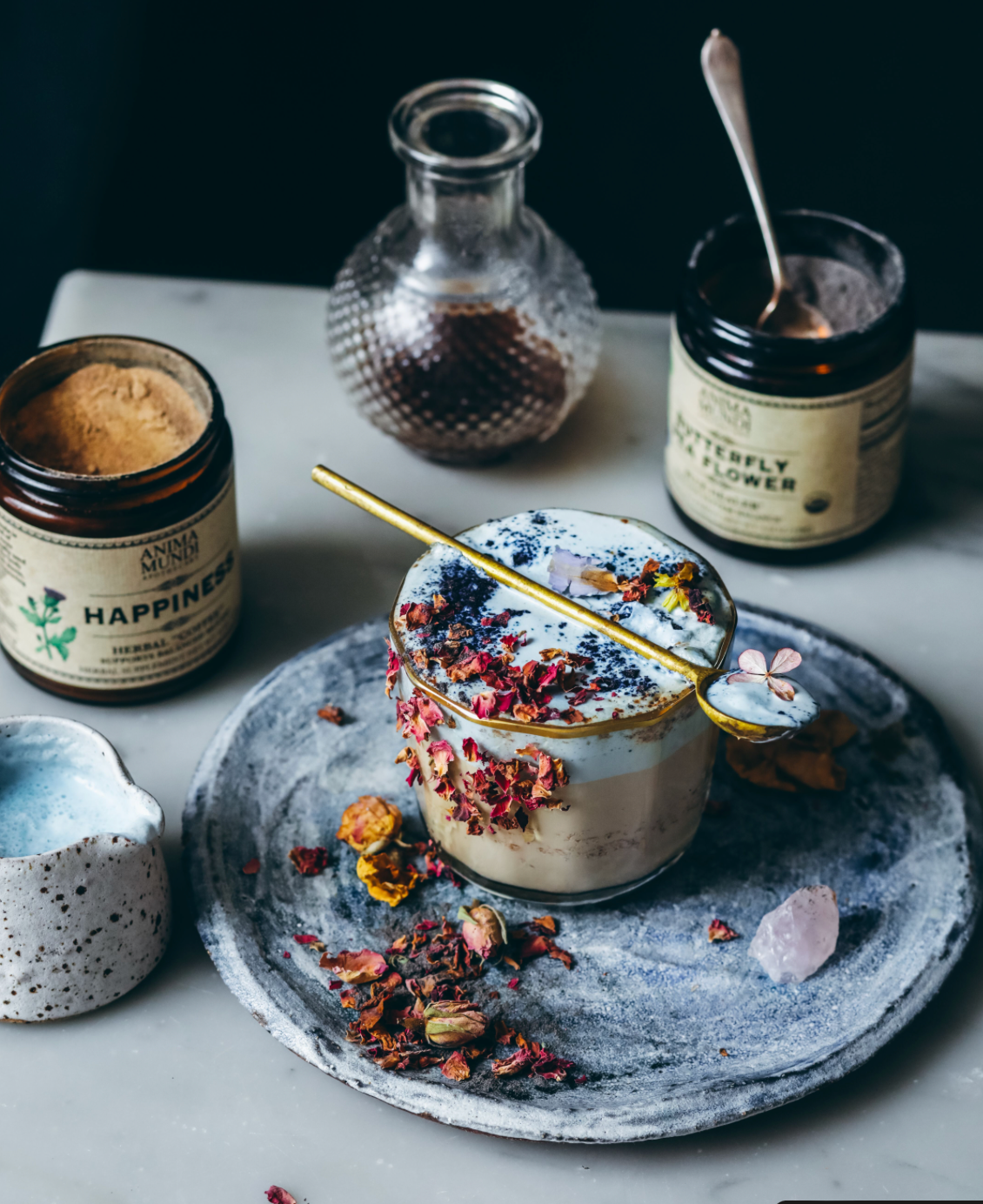 Bitter coffee floats between two layers of sweet frothy cream to create a gorgeous gradient effect in this show-stopping latte. The uplifting potency of Happiness Powder and soothing benefits of Butterfly Pea Flower combine in this exquisite drink for a treat that is equally nourishing and delicious.