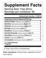 Spirulina (Arthrospira platensis) Algae (E)*, Chlorella (Chlorella pyrenoidosa) Algae (E)*, Moringa (Moringa oleifera) Leaf (E)*, Chanca Piedra (Phyllantus niruri) Leaf (E), Dandelion (Taraxacum officinale) Root (E)*, Graviola Soursop (Annona muricata) Leaf (E), Holy Basil (Ocimum tenuiflorum) Flower (E)*, Lemon (Citrus limon) Peel (E)*, Lemongrass (Cymbopogon citratus) Leaf (E)*