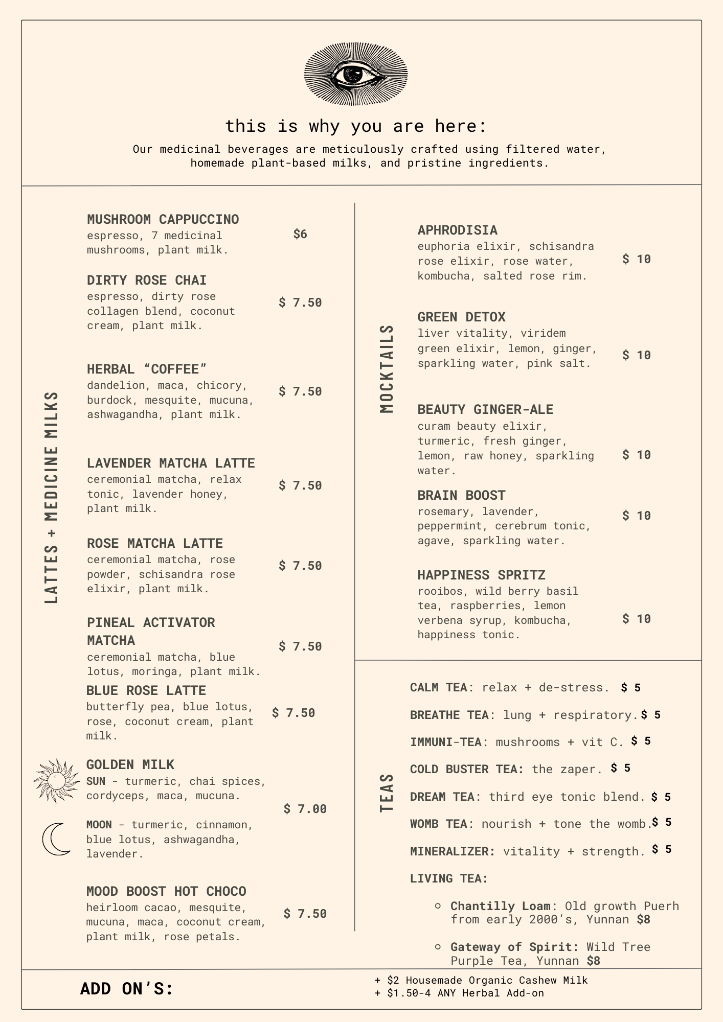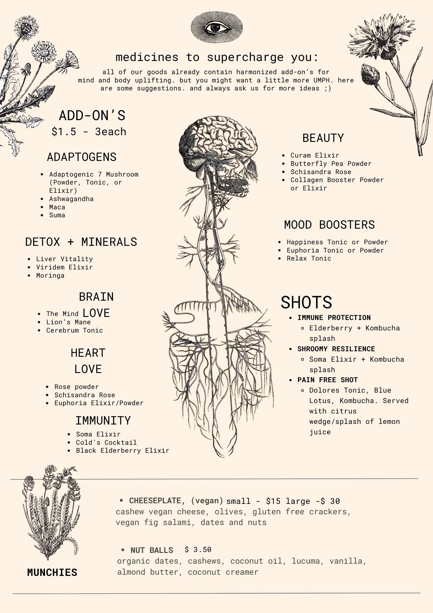 We have an exquisite selection of medicinal lattes, teas, kombucha mocktails and more. For our lattes we offer homemade cashew milk or oat milk. Our entire selection is vegan, organic +/or wildcrafted. We take pride in making unique magic infused with high vibrational goodness. Come join us, get boosted with medicine and some good vibes.