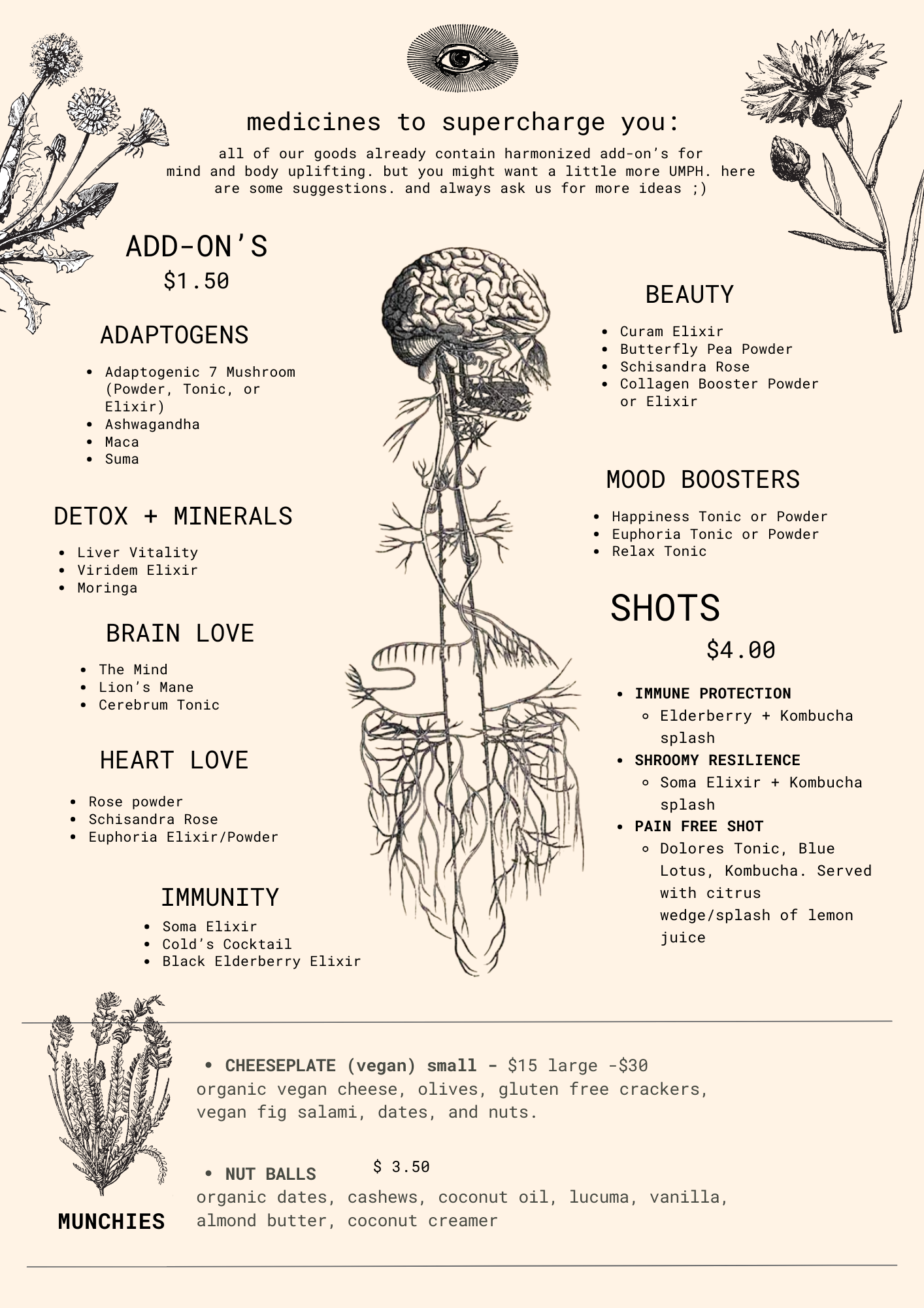 We have an exquisite selection of medicinal lattes, teas, kombucha mocktails and more. For our lattes we offer homemade cashew milk or oat milk. Our entire selection is vegan, organic +/or wildcrafted. We take pride in making unique magic infused with high vibrational goodness. Come join us, get boosted with medicine and some good vibes.
