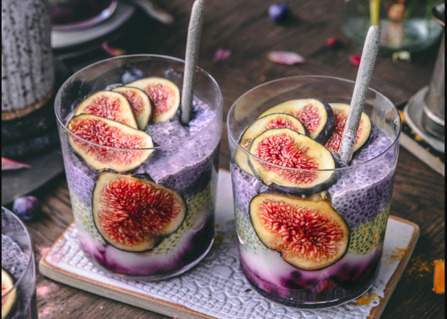 When you’re ready to make your pudding: Layer your compote first, followed by the other divided portion of yogurt. Place a layer of Golden Sun Milk mixture on top followed by the blueberry/Belly Love mixture. Garnish with fruits. Enjoy!